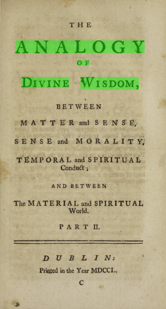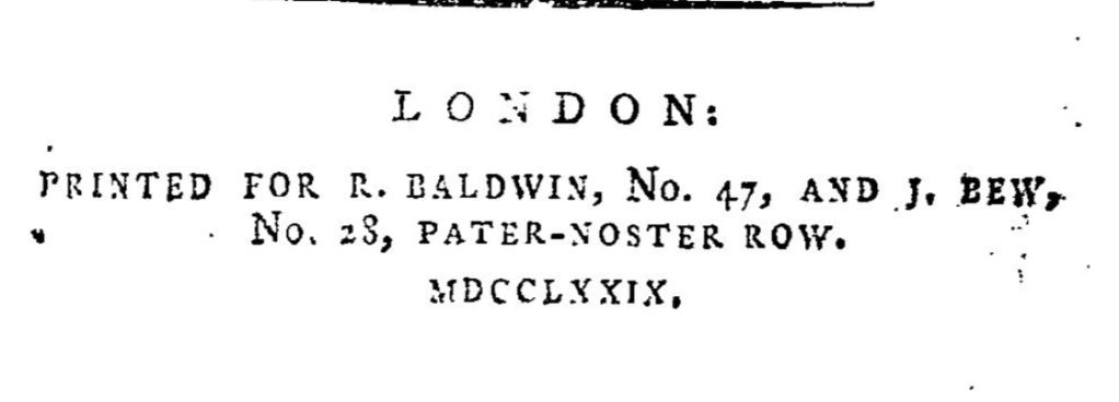 In June 1750, R. Baldwin also re-published Richard Barton’s Analogy of Divine Wisdom, an eight-part book exploring the namesake subject in a variety of material, moral, civil and spiritual systems, as well as the nature of morality itself and how to use reason in a Christian context. As an example, Barton likens the attraction of cohesion towards the physical attraction of gravitation, as if to say that someone’s love of their country is theoretically stronger than a more general benevolence to all humanity, in the same way that a whole stone held in one’s hand is bound to gravity, even the portions that aren’t fully grasped, meaning the stronger principle of adhesion prevails (Barton 1750, 59).