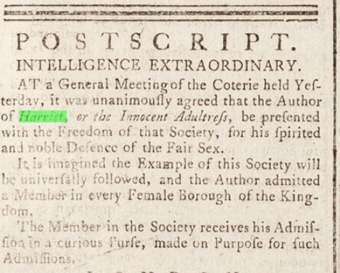 Harriet, or, The Innocent Adultress is a novel anonymously written and released in 1771. Its narrative split between two volumes, the eponymous protagonist is the youngest of three sisters in the modest Courtly family, who is married off to the wealthy and bodacious Lord Fillmore after an arrogantly persistent pursuit of her affection. She subsequently becomes entangled with the empathic Prince who, alongside her close acquaintance the Countess of D., observes that Harriet is experiencing continuous neglect from her callous husband, content with prioritizing the company of his upperclassmen peers in Newmarket over spending time with his newlywed. When the affair between Harriet and the Prince is made public, the former is put on trial under the presumption of committing adultery. This proceeding informs the story’s basis, as a series of exchanges between the prosecution and defense color in the narrative’s chronology by charting alleged sightings of the discreet pair at Kensington Parks, Carlisle House and the opera.