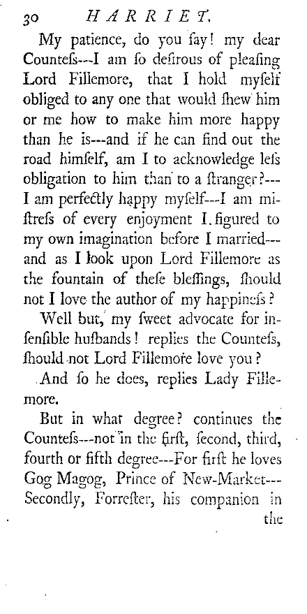 In Section III, Fillemore begins seeking Harriet’s hand in marriage through courting her father, but the novel surprisingly subverts the expectation that a man of modest standing such as Mr. Courtly, would be instantly seduced by the wealth flaunted by Fillemore, and prefers not to speak on behalf of what Harriet herself would want, encouraging Filemore to make his desire for Harriet known to her directly. The bonding between the pair is only initiated when Harriet is convinced to reciprocate Fillemore’s desires, which ascribes the former with an autonomy that isn’t encroached on by a party with controlling interest, nor is it relinquished with encouragement from external authority figures, and this decision therefore garners a certain sympathy towards Harriet when Fillemore himself becomes absent and unwilling to prioritize her company over the story’s duration. Moreover, the narrative illustrates that Harriet leaving Fillemore and forgoing the social expectations placed on her to remain faithful regardless of circumstance, is not only considered but encouraged as a more positive outcome for her wellbeing. In section VIII, the Countess of D. reasons with Harriet regarding Fillemore, humorously listing all of the individuals in the latter’s life that have taken precedence over Harriet despite their marriage, such as the Prince of Newmarket, his rider Tom Marshal, Macaroni, his groom, and so on, going as far as to reveal he had been seeing a young Duchess behind her back. Without the complete story reserved, it is impossible to know whether Fillemore’s infidelity was leveraged as evidence against the accusations of adultery leveled against Harriet in the trial that precedes the main narrative, but I found that the author harbored a very nuanced perspective on the factors that would motivate any woman of Harriet’s predicament towards such behavior, and I appreciated that the book refrained from coloring her beliefs and actions in a consistently discouraged light by refraining from glorifying the culture and activities partaken by people like Fillemore who grew up enjoying higher privileges, thereby finding their own behaviors acceptable even at the expense of people beneath them socially.